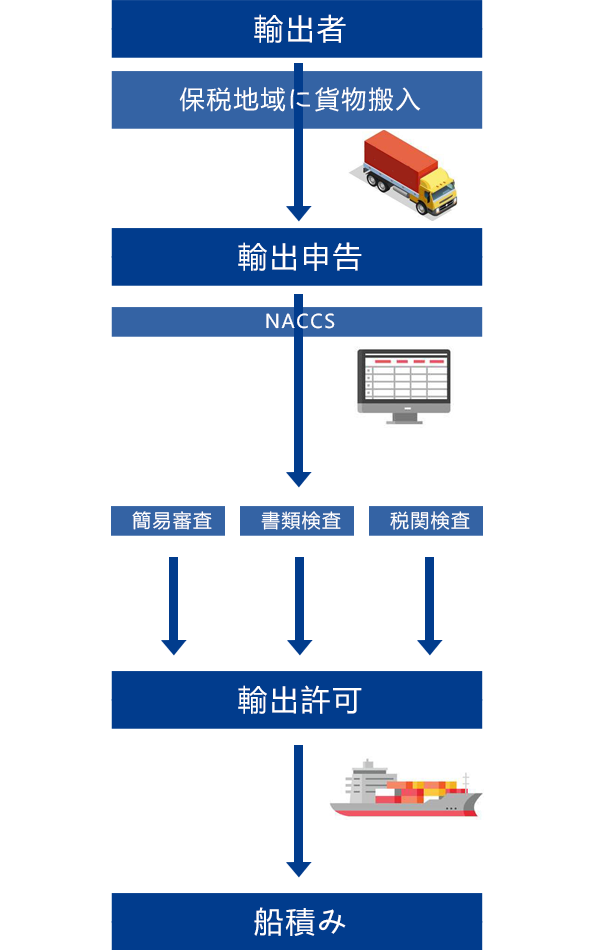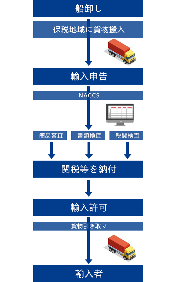 1. 書類のチェックや税関への申告 2. 税関検査の立ち合い 3. 関税や消費税の納付 4. 貨物の引き取りに関連する作業 5. デバンニング、バンニングの代行や手配 6. 国内配送の手配 7. 税関事務管理(ACP)