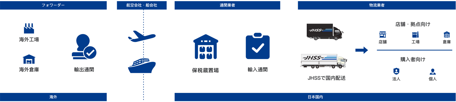 JHSSは保税倉庫を直営しており、輸出入貨物の通関業務・保税作業の一貫処理及び 合理的なコストの提案でお客様に最適で安心なサービスを提供しております。