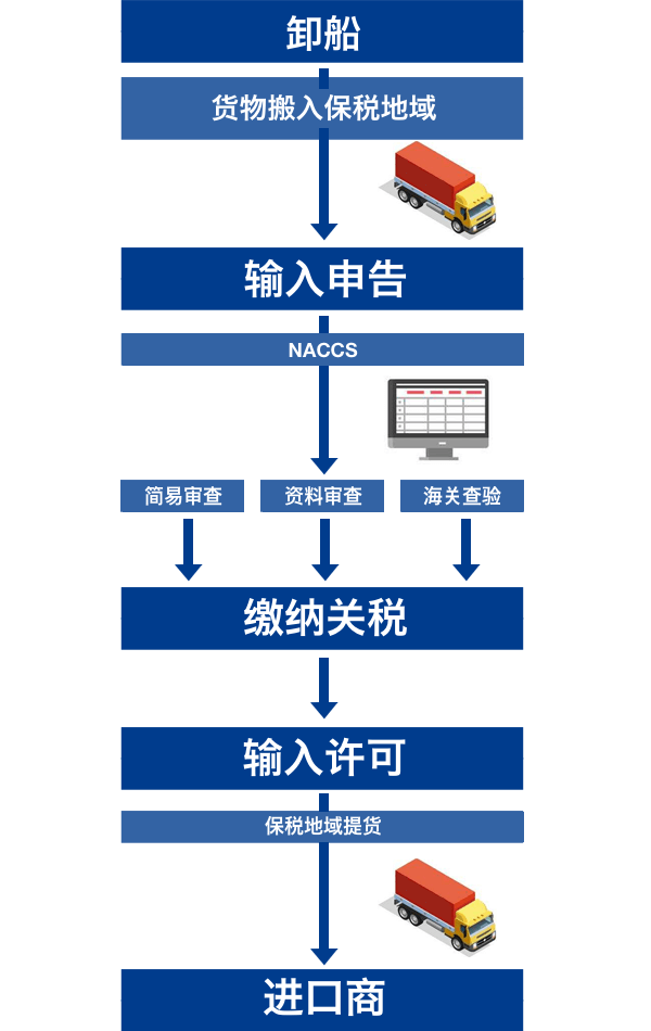 1.清关资料的审查及进出口申报业务 2.税关检查时的在场随同 3.关税及消费税的缴纳 4.保税地域提货时的相关操作 5.拆柜,装柜业务的代行及安排 6.日本国内派送业务的安排 7.税关事务管理(ACP)