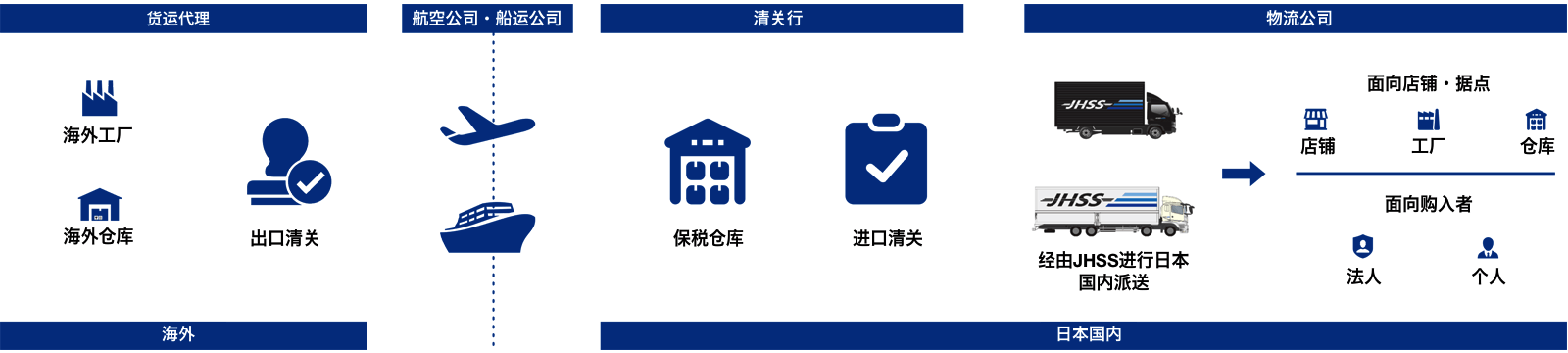 JHSS拥有直营保税仓库,可以提供进出口货物清关业务・保税作业的操作及合理的成本建议,为客户提供最佳,放心的服务。